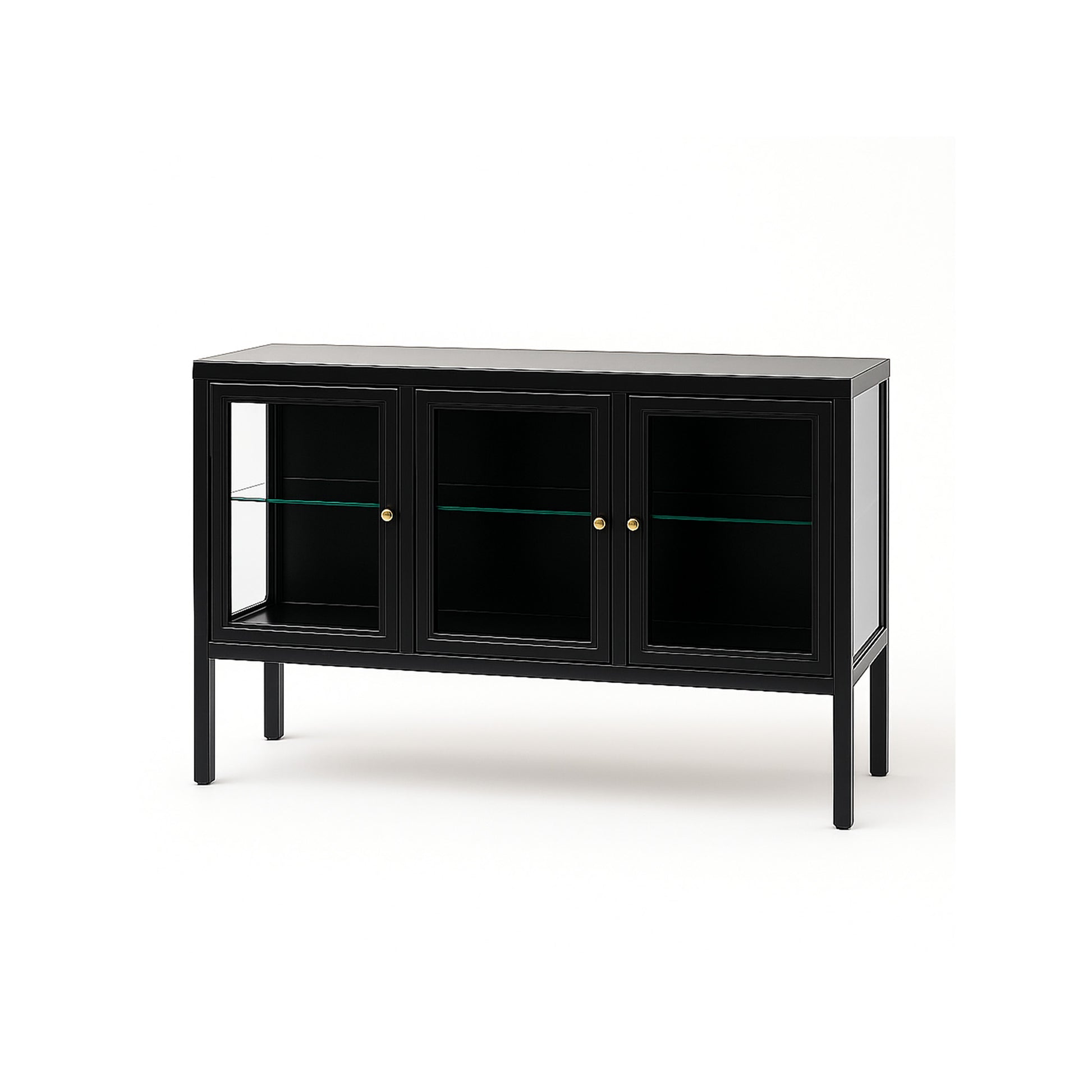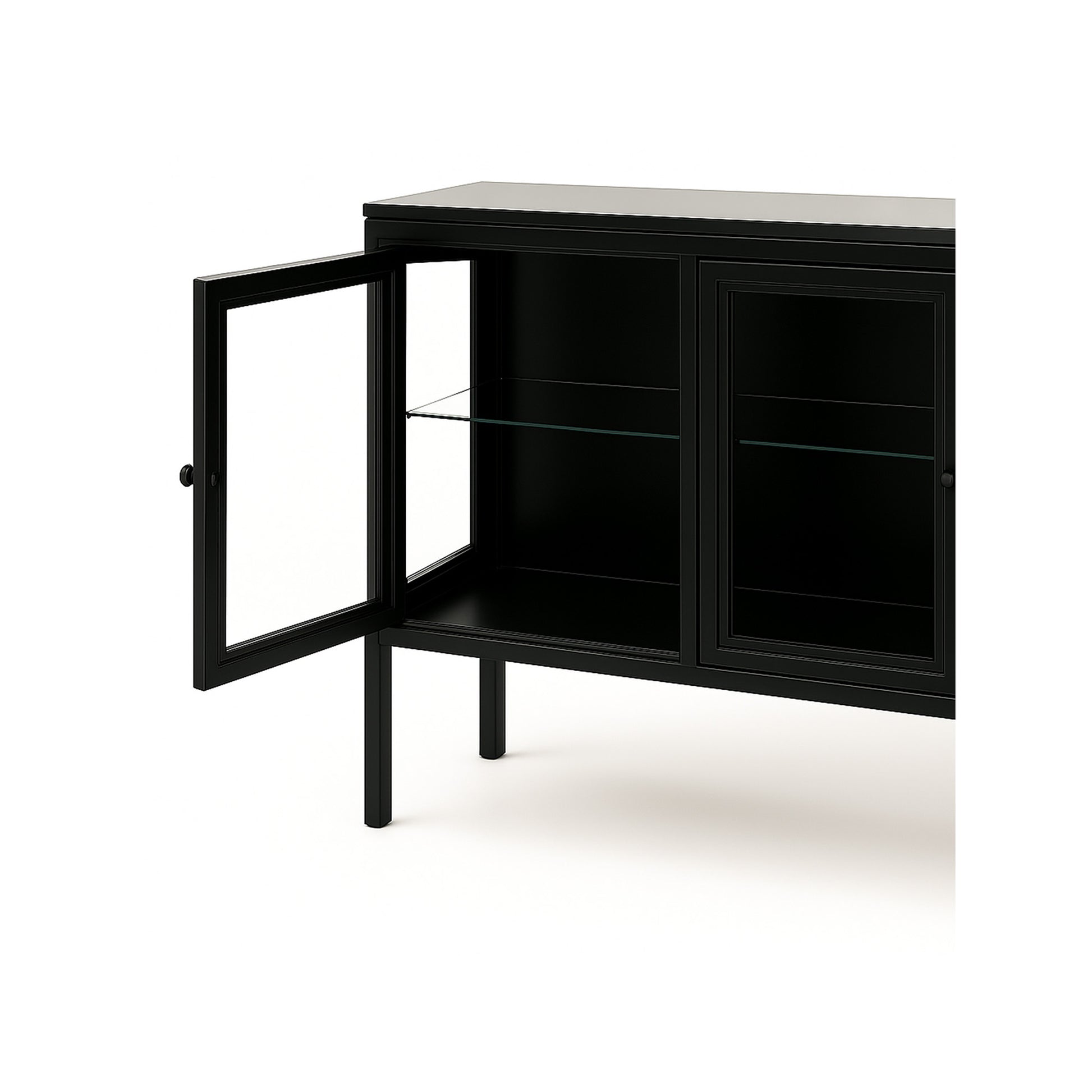 Carmen skænken er en stilren og moderne opbevaringsløsning, der kombinerer sortlakeret metal med elegante glasplader. Det lette, tidløse design gør den perfekt til både stuen, spisestuen eller entréen, hvor den giver et eksklusivt udtryk uden at virke tung.