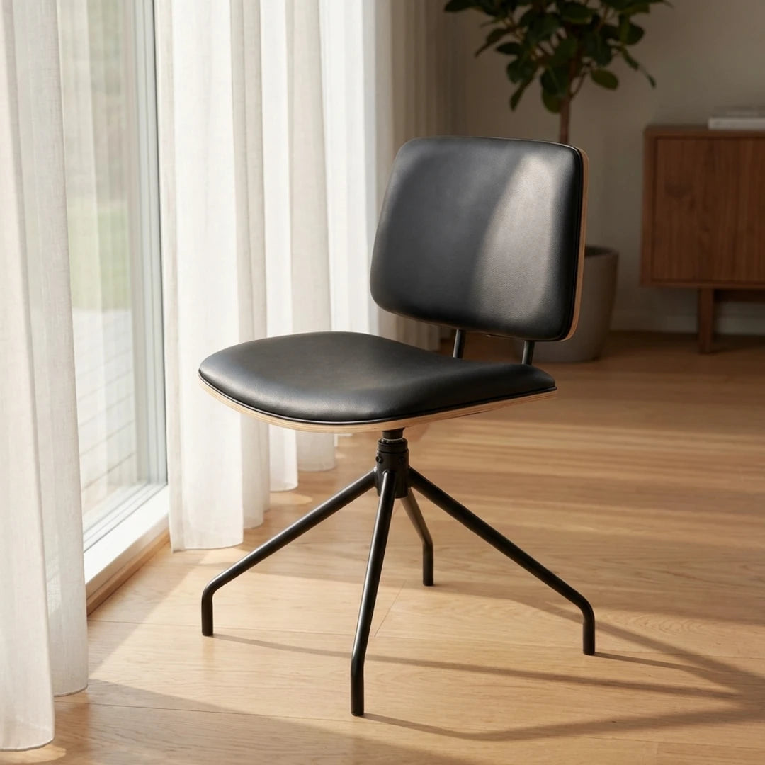 Vores Forma-spisebordsstol – i denne version med drejefunktion, kommer til sin ret ved både spise- og arbejdsbordet. Stolerammen i egetræ er akkompagneret af enten sort læder eller lækkert lyst stof, hvis farve matches af benene, hvilket giver en helstøbt sidde- og synsoplevelse.